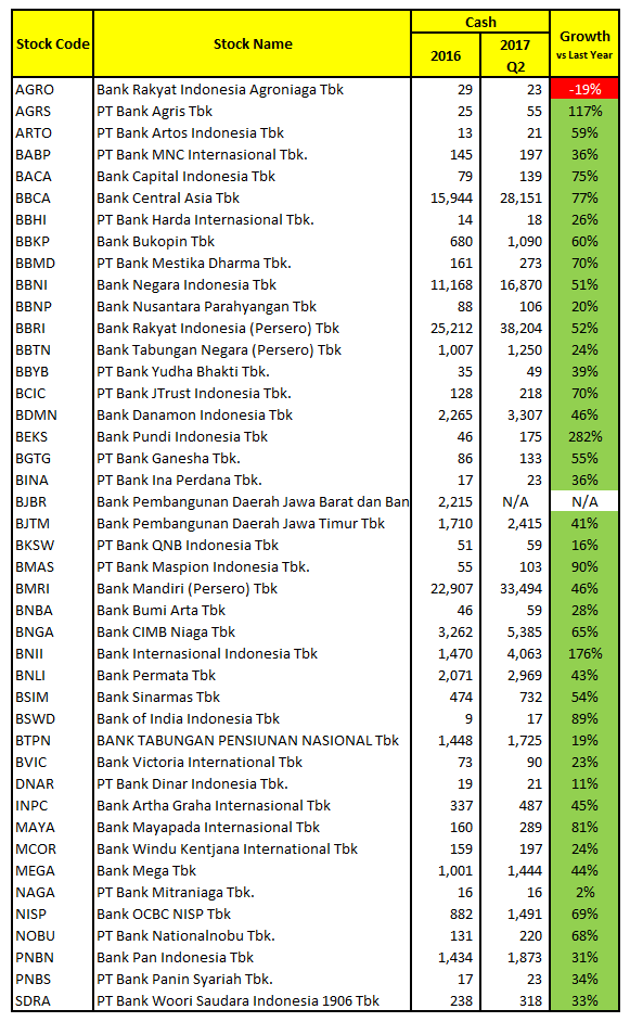 Saya coba summary kan kenaikan kas emiten perbankan di BEI dari End of Year 2016 VS Q2 2017. Jika kita perhatikan, kecuali AGRO, jumlah kas emiten Perbankan mengalami peningkatan yang cukup signifikan. Silakan lihat tabel di bawah ini untuk lebih lengkap nya..