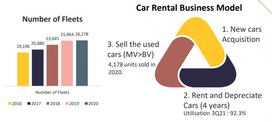 Sampai dengan akhir tahun 2022 kemarin, ASSA mengelola lebih dari 26 ribu mobil yang disewakan – mostly ke B2B segment (disewakan ke korporat). Bisnis modelnya pun cukup atraktif, di mana setelah ASSA membeli mobil baru dan menyewakannya, ASSA melakukan penjualan mobil-mobil tersebut dengan harga di atas book value mobil tersebut. Jasa penyewaan mobil ASSA ini juga telah tersebar di seluruh penjuru Indonesia.
