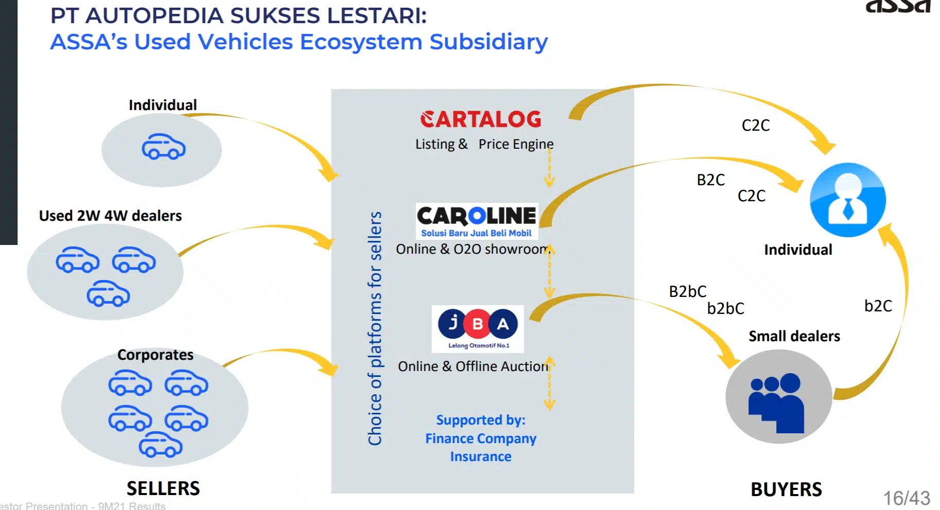 Bisnis ASSA yang juga terintegrasi dari bisnis pertama adalah Autopedia. Autopedia merupakan anak usaha dari ASSA, di mana bisnis Autopedia sendiri adalah fokus ke penjualan kendaraan bekas (secondhand vehicle). Penjualan kendaraan bekas ini dilakukan melalui berbagai channel; lelang (JBA, merupakan market leader di Indonesia), dan platform jual beli online (Caroline). Sebagai pelengkap, salah satu keunggulan dari ASSA adalah kepemilkan database yang besar dari penjualan kendaraan bekas, sehingga ASSA dapat meningkatkan kapabilitas dan teknologi (menggunakan artificial intelligence) untuk mengapresiasi harga kendaraan bekas. Jasa ini dikenal sebagai Cartalog.