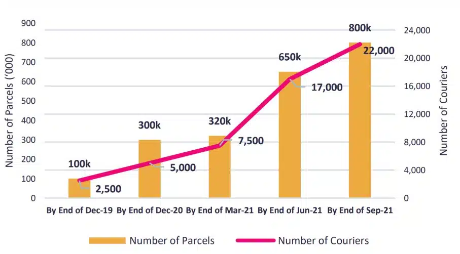 Sekarang AnterAja merupakan salah satu pemimpin pasar di sektor last mile logistic delivery. Peningkatan eksponensial juga terjadi di operasional ASSA. Dari hanya mengantar 100k parcel/hari pada akhir tahun 2019, sekarang ASSA telah meningkatkan kapasitas dan eksekusinya dengan mampu mengantar sampai 800k parcel per hari sampai dengan akhir September 2021 lalu. Bahkan, ketika sedang peak season, kami melihat tidak mengherankan apabila ASSA dapat mengantar lebih dari 1-2 juta parcel per hari (twin dates, seperti promo 12.12/01.01, misalnya.) Di bawah ini adalah ilustrasi pertumbuhan AnterAja…